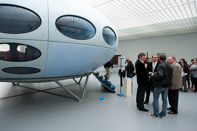 There are also quite a few videos out there of the "Ballads" exhibition though they generally only show the Futuro is passing. A couple are shown below but a Google Search will return more. The first is by Jos Burger [Futuro at around 0:07] and the second is by anykoen [Futuro at around 1:14]. Original Images & Video 091011 The original Futuro prototype, Futuro #000, was the central feature of the 2011 exhibition "Futuro - Constructing Utopia" at the Museum Boijmans Van Beuningen. The video below is narrated by the exhibitions curator Curator Jonieke van Es and includes great footage of the Futuro along with a historical commentary. The wonderful set of photos shown below show the restored prototype at the "Futuro - Constructing Utopia" exhibition. The photos, shot 052811, are by Happy Famous Artists and are displayed here under CC 2.0.
