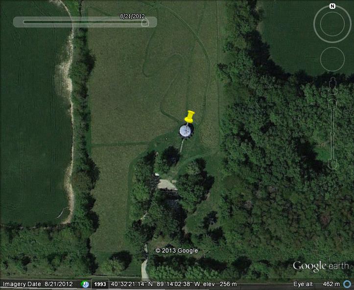A while ago I was sent a link to a web page archived by the Internet Archive Wayback Machine. I do not recall who sent me the link [let me know and I will credit you] but I do recall it was suggested that the photos on the page were of Richard Pisani's Danvers Futuro House. Pisani bought his Futuro in 1997 and, as reported in the New York Times on 072805, by 2004 Pisani had become one of the world's foremost authorities on the Futuro House. Pisani set up the website Futuro-House.net which is still up today. The archived webpage is from Futuro-House.net but is no longer an active page. My initial reaction when I looked at the photos on the web page was that it did appear similar to the Futuro House now in Danvers; in particular both have the same type of vent centered on the top of the unit and both have the same window configuration. However, looking at the structure of the archived web page I began to have doubts. The webpage was an archive of several photo galleries. One of the galleries was titled 'My Futuro"; there was another gallery titled "Other Futuros" and within that one was one called "Central Ill Futuro" which contained the photos shown at left. It seemed to me that if the photos were of Pisani's Futuro, albeit at a previous location, they would not be in a gallery titled "Other Futuros". In addition a notation against the "Central Ill Futuro" gallery reads: "Started out life in Ohio then to Illinois state fair grounds then here" If this was Pisani's Futuro then surely the comment would have continued on to state that the Futuro was now in Danvers or words to that effect. Those thoughts left me with sufficient doubt to cause me to take a quick trip through some historical imagery in Google Earth where I quickly confirmed the photos were not of the Futuro now in Danvers and that in fact there is no reason to think that my earlier conclusion that this Futuro is now located at Livingston was incorrect. True the Livingston unit does not appear to have the vent on the top of the unit but it was completely disassembled when it was moved and it is entirely possible that the vent was not reinstalled. The screenshots below are from Google Earth and show [from the top]: